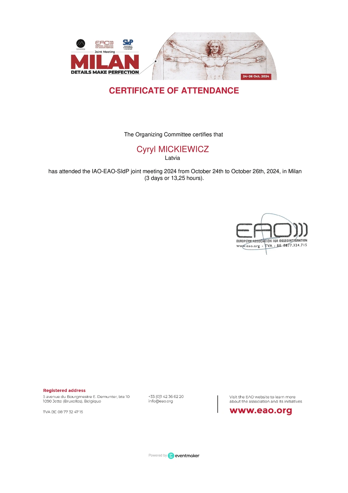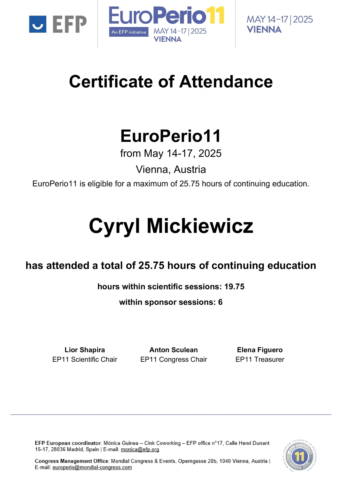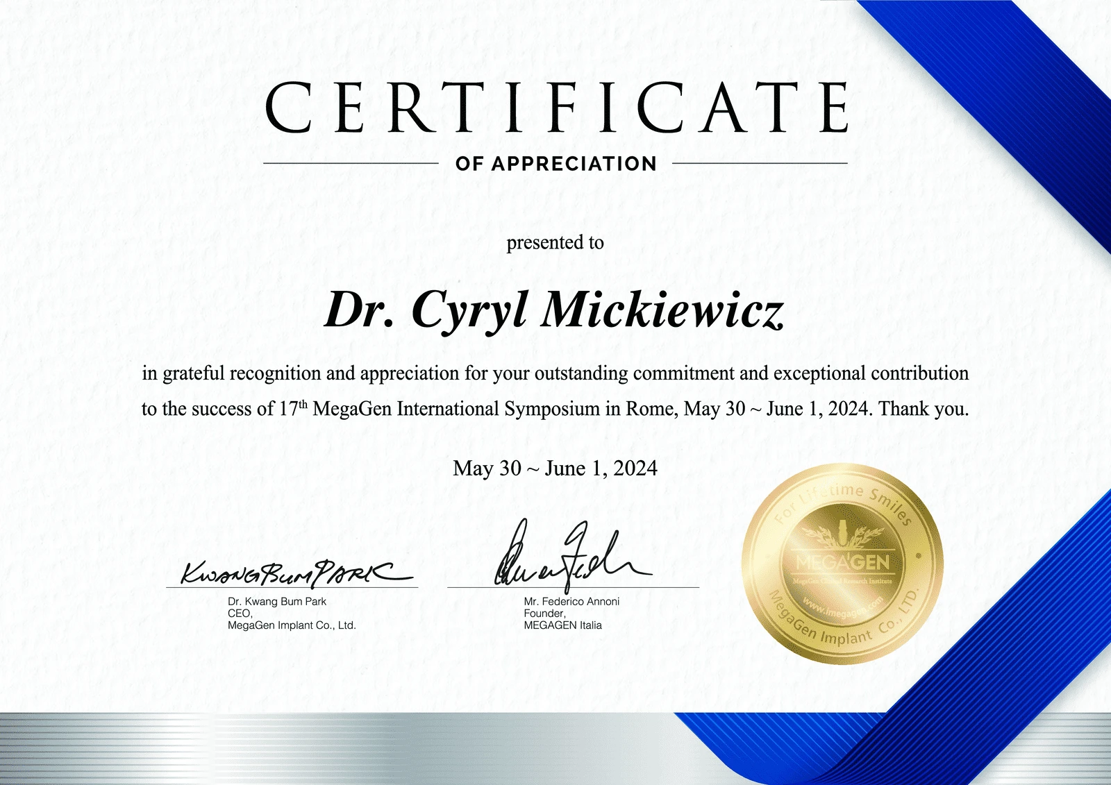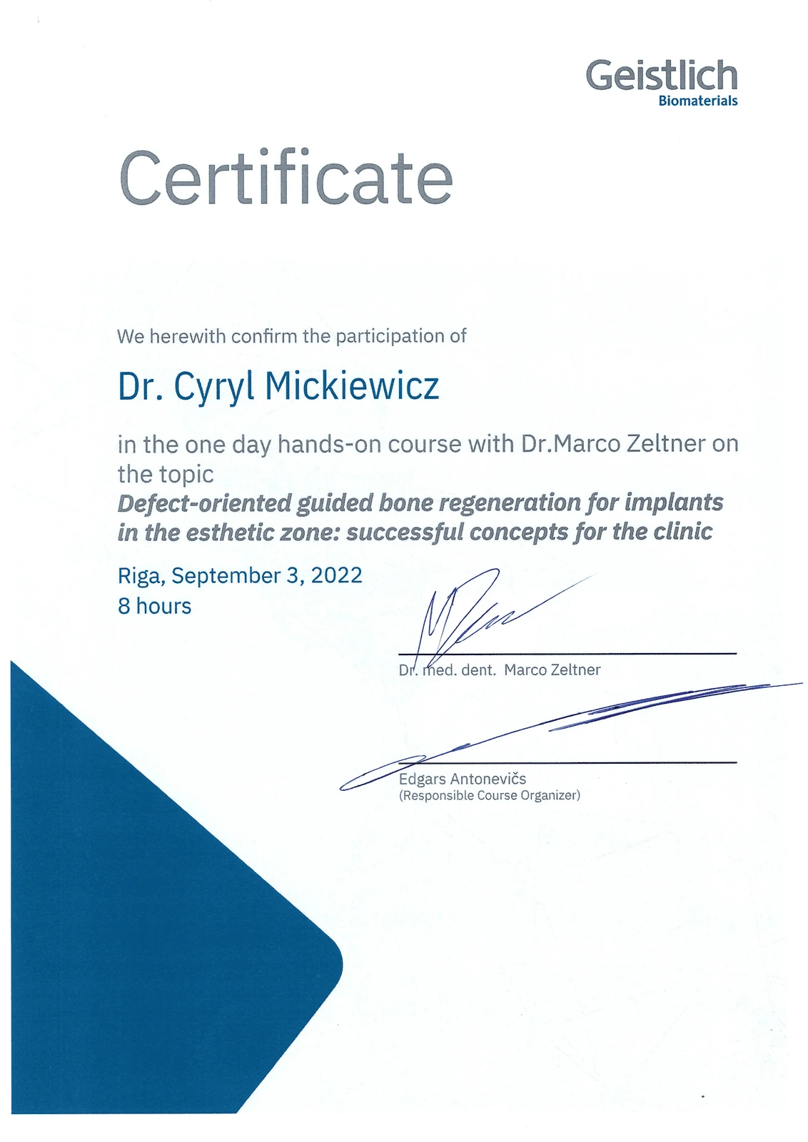 Absolwent w zakresie protetyki stomatologicznej na Uniwersytecie Genewskim (Szwajcaria) na Katedrze Stomatologii Protetycznej.