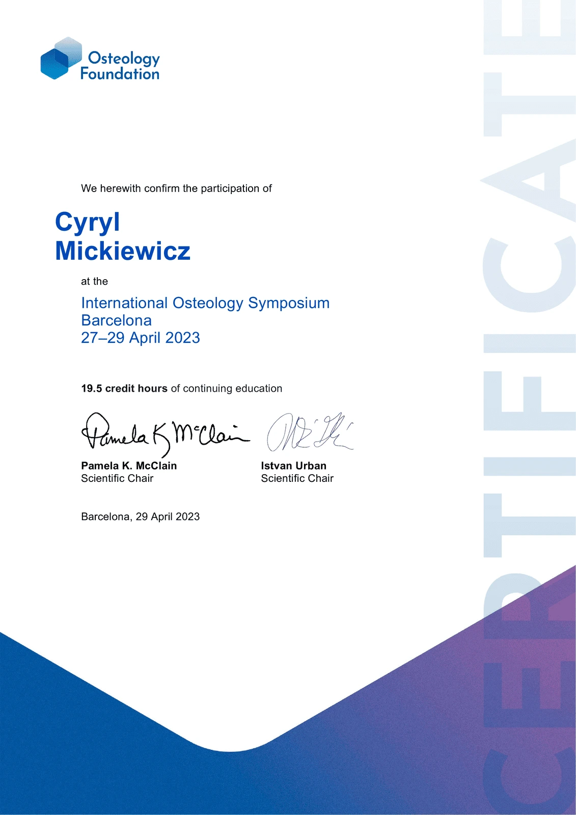 2019 - 2020 - szkolenie w STEIGMANN INSTITUTE Heidelberg (Niemcy) - implantologia, plastyka kości i tkanek miękkich.