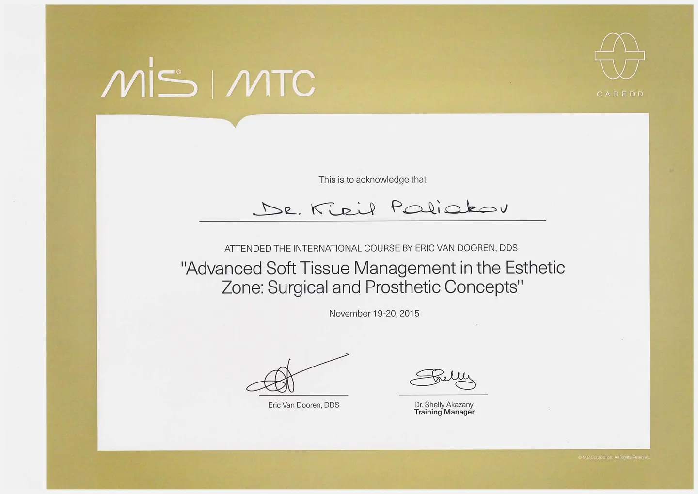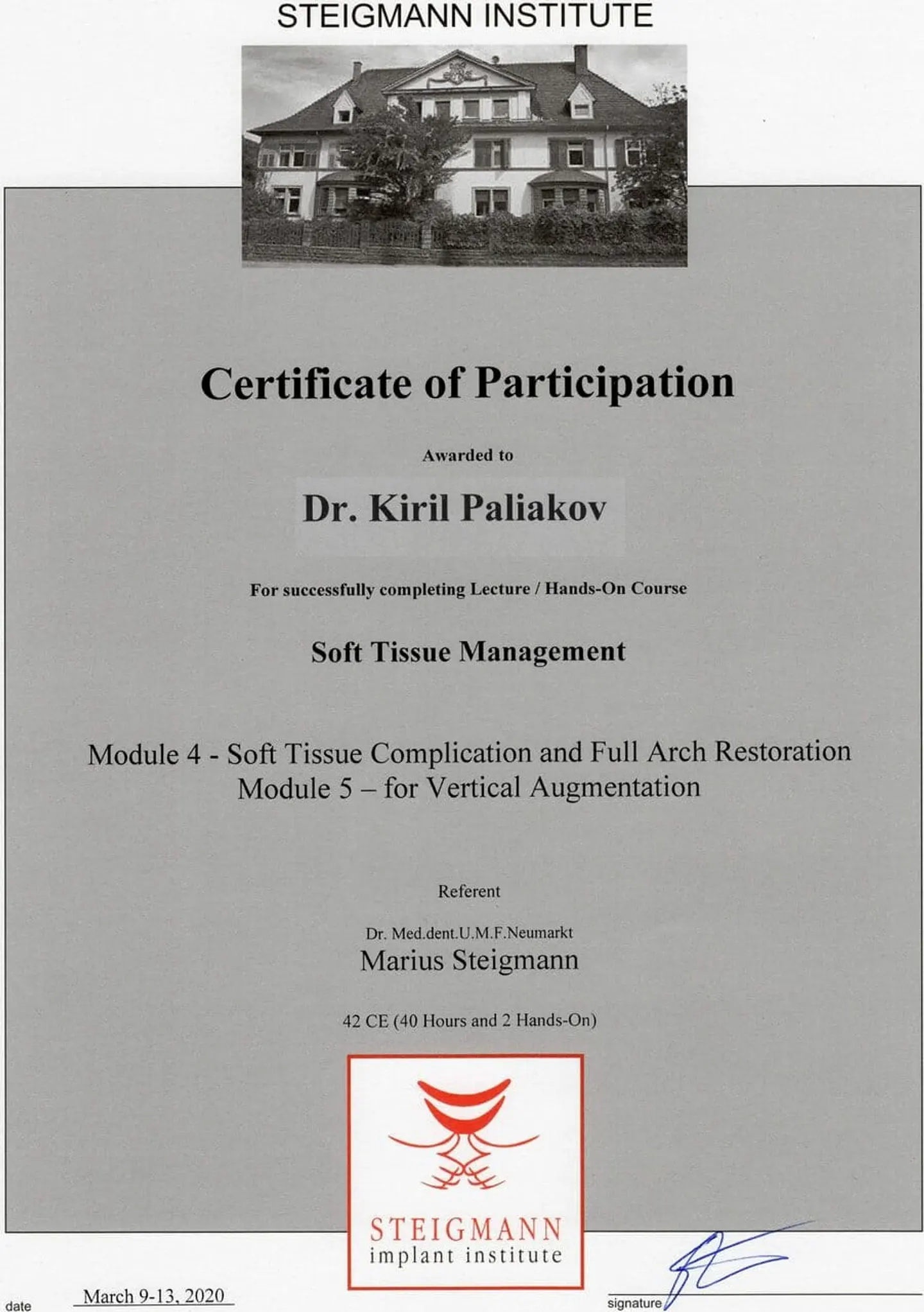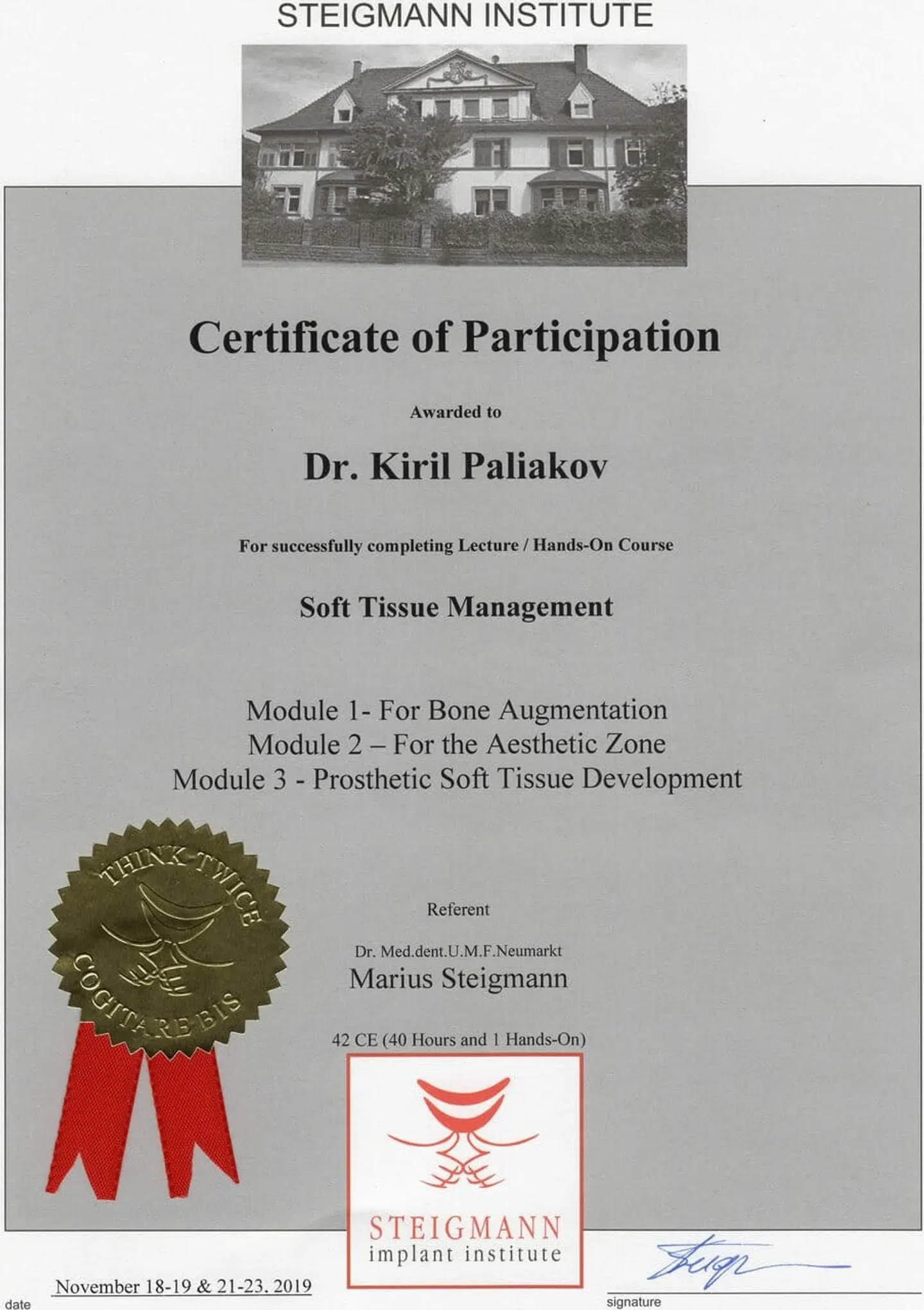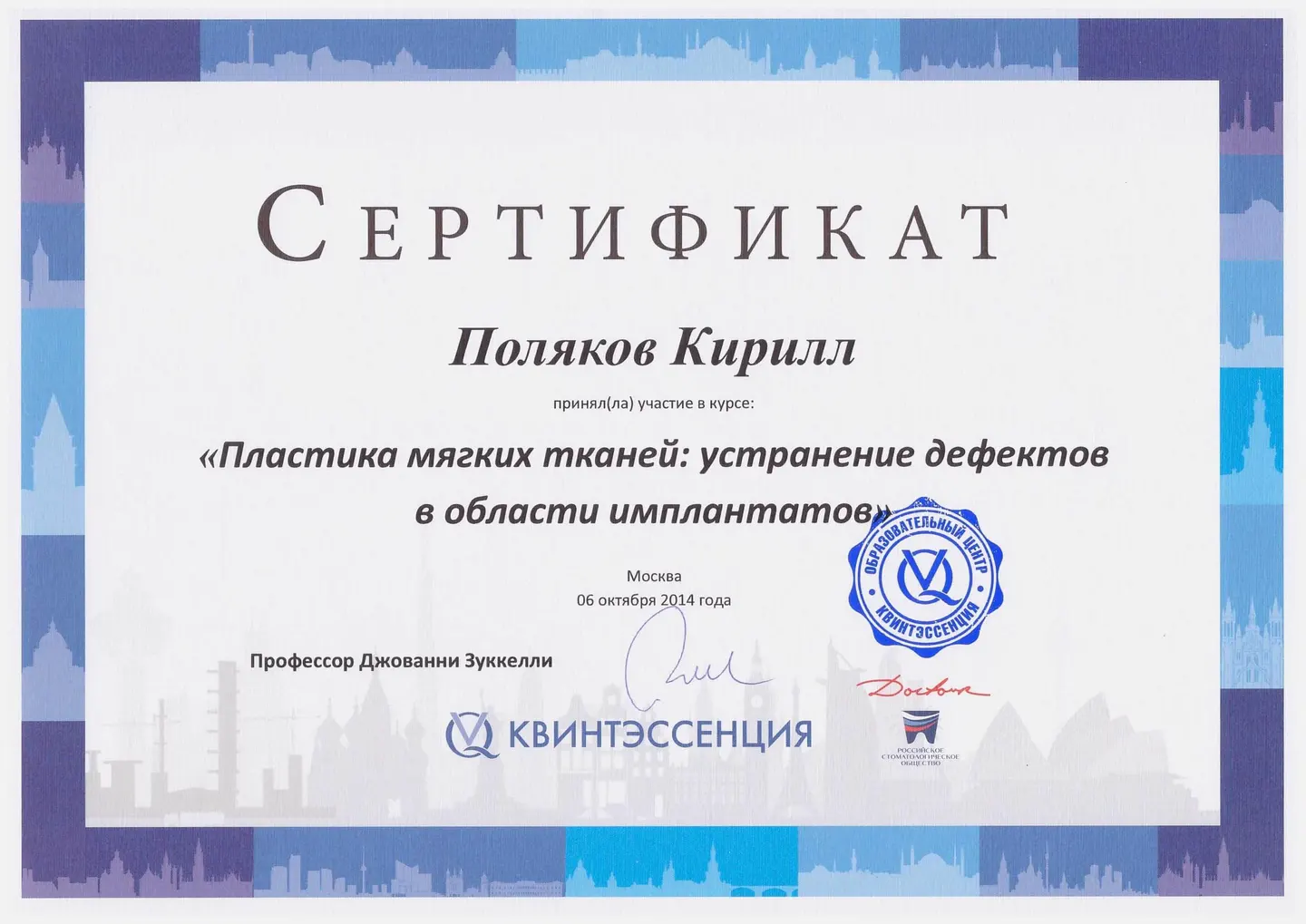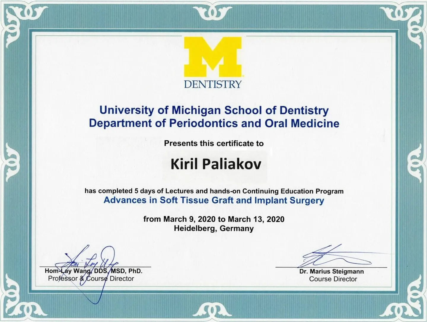 2019 - 2020 года - обучение в STEIGMANN INSTITUTE Heidelberg Германия) - имплантология, костная пластика и пластика мягких тканей.