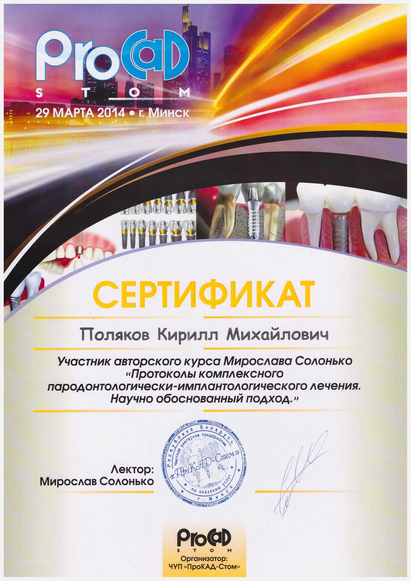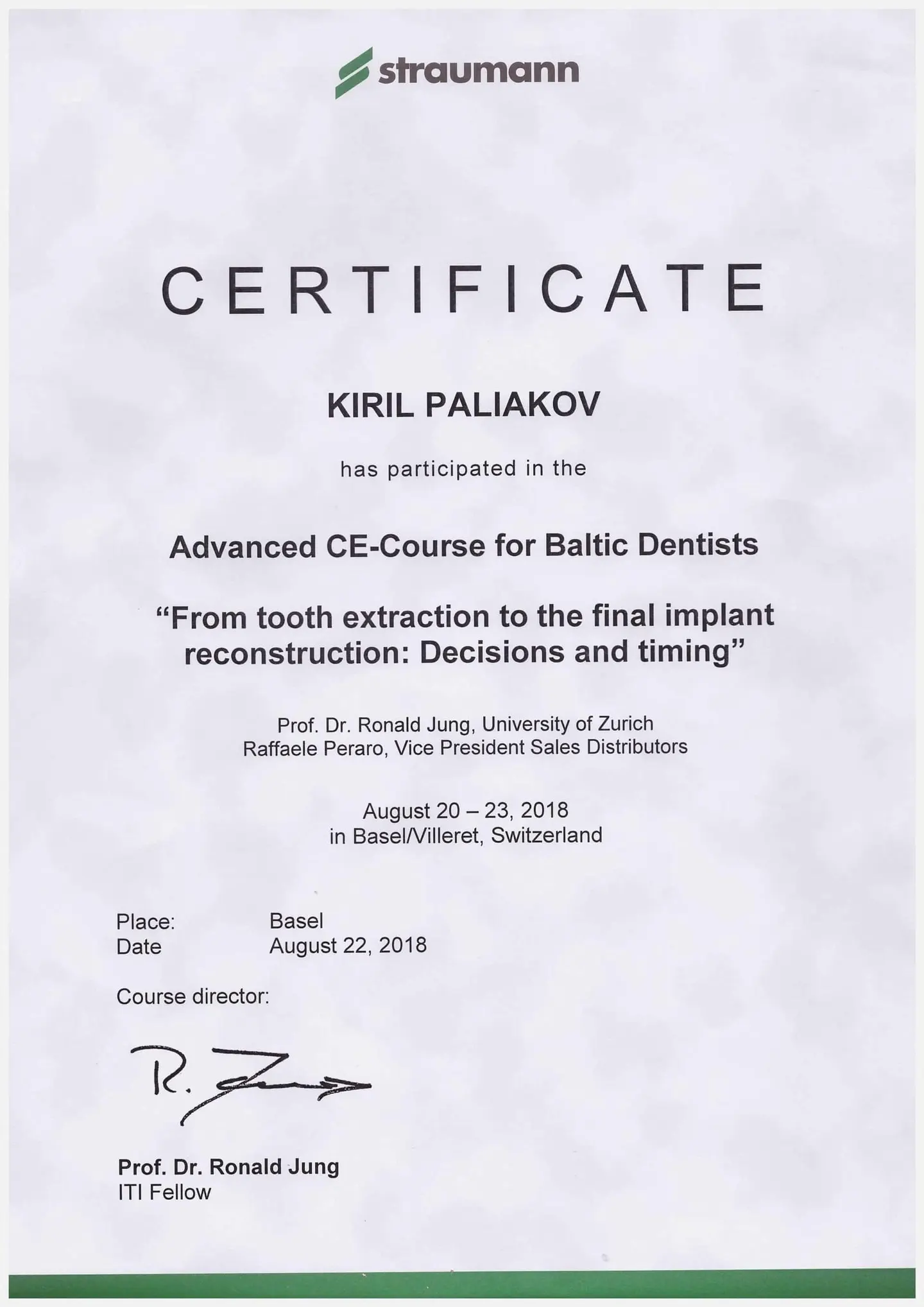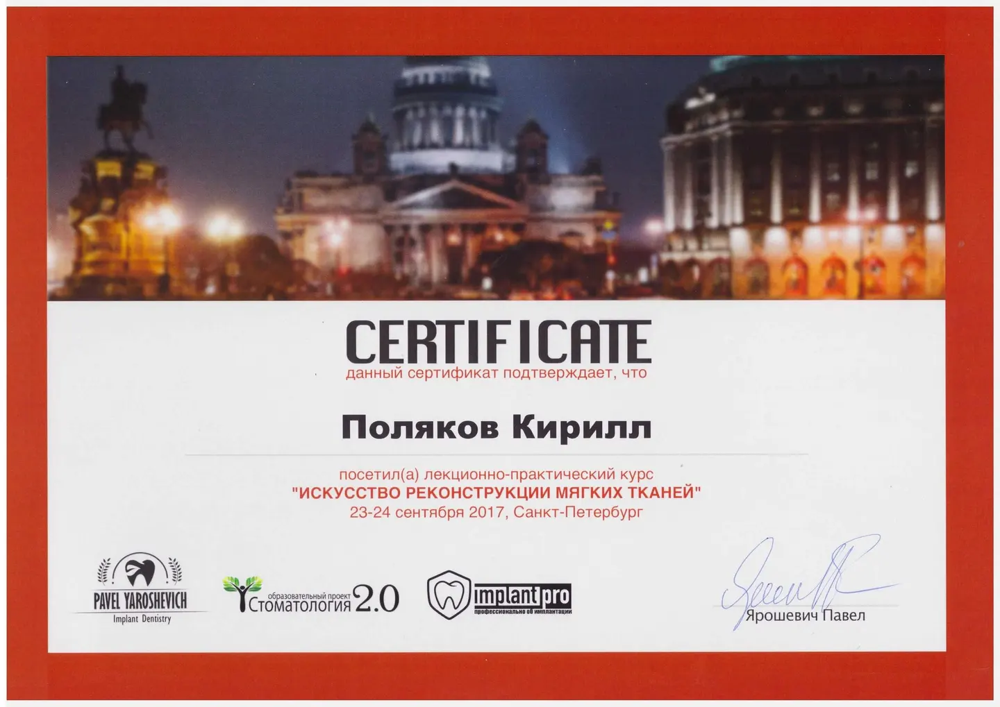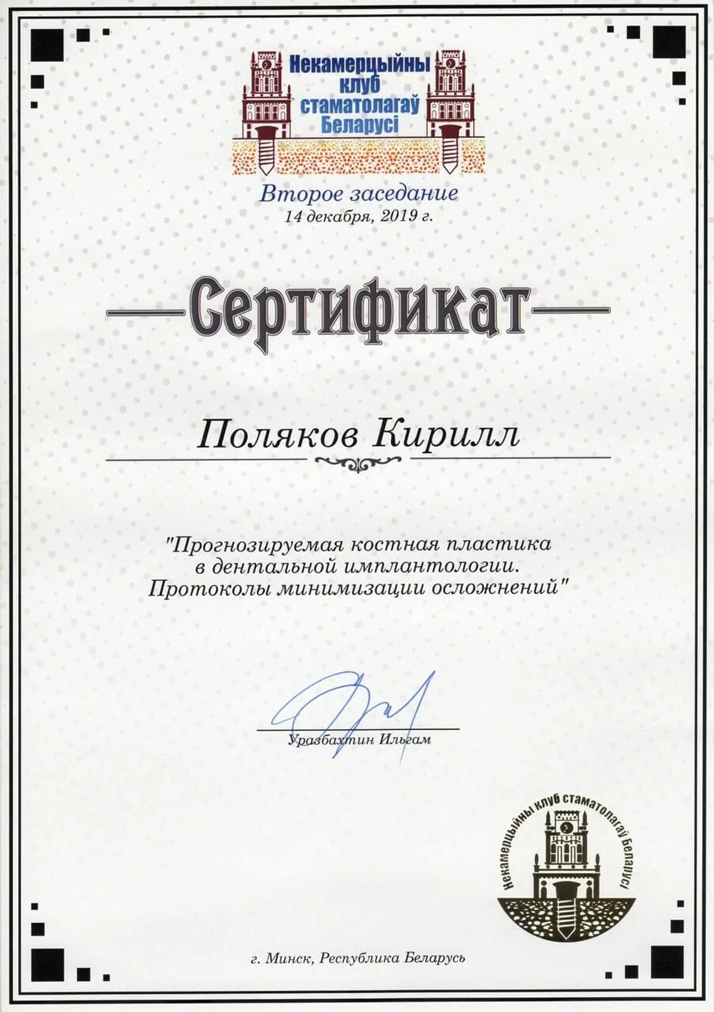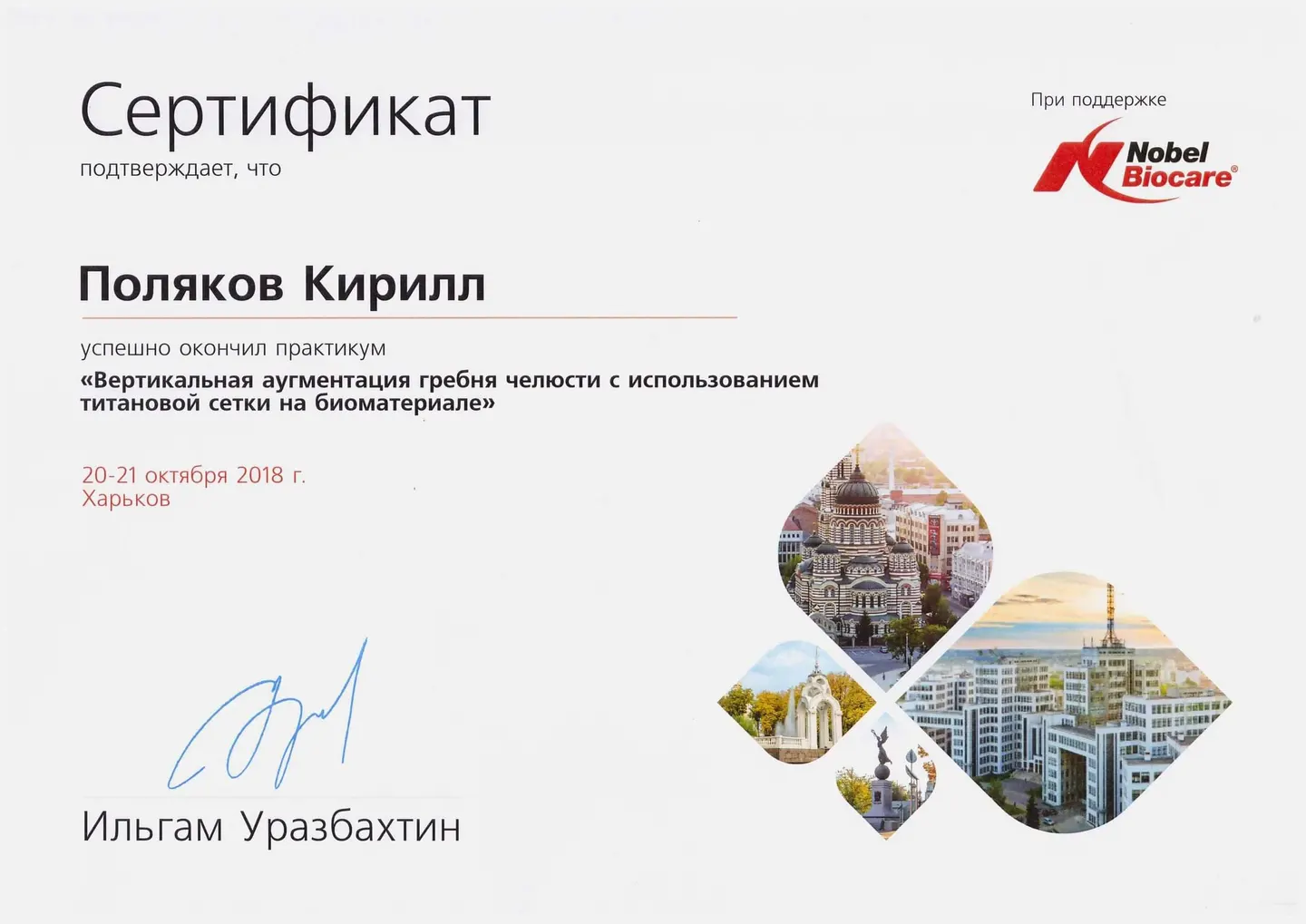 2019 - 2020 года - обучение в STEIGMANN INSTITUTE Heidelberg Германия) - имплантология, костная пластика и пластика мягких тканей.