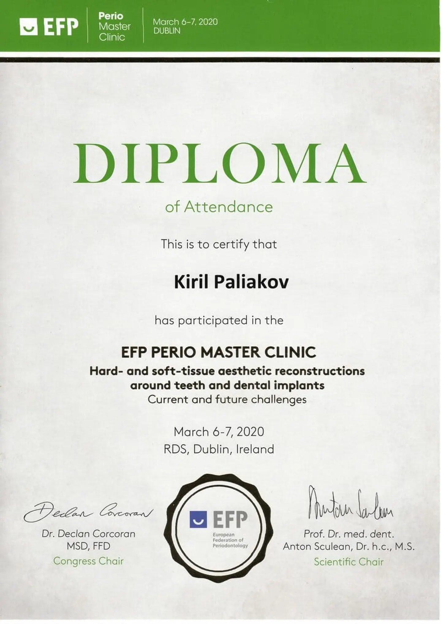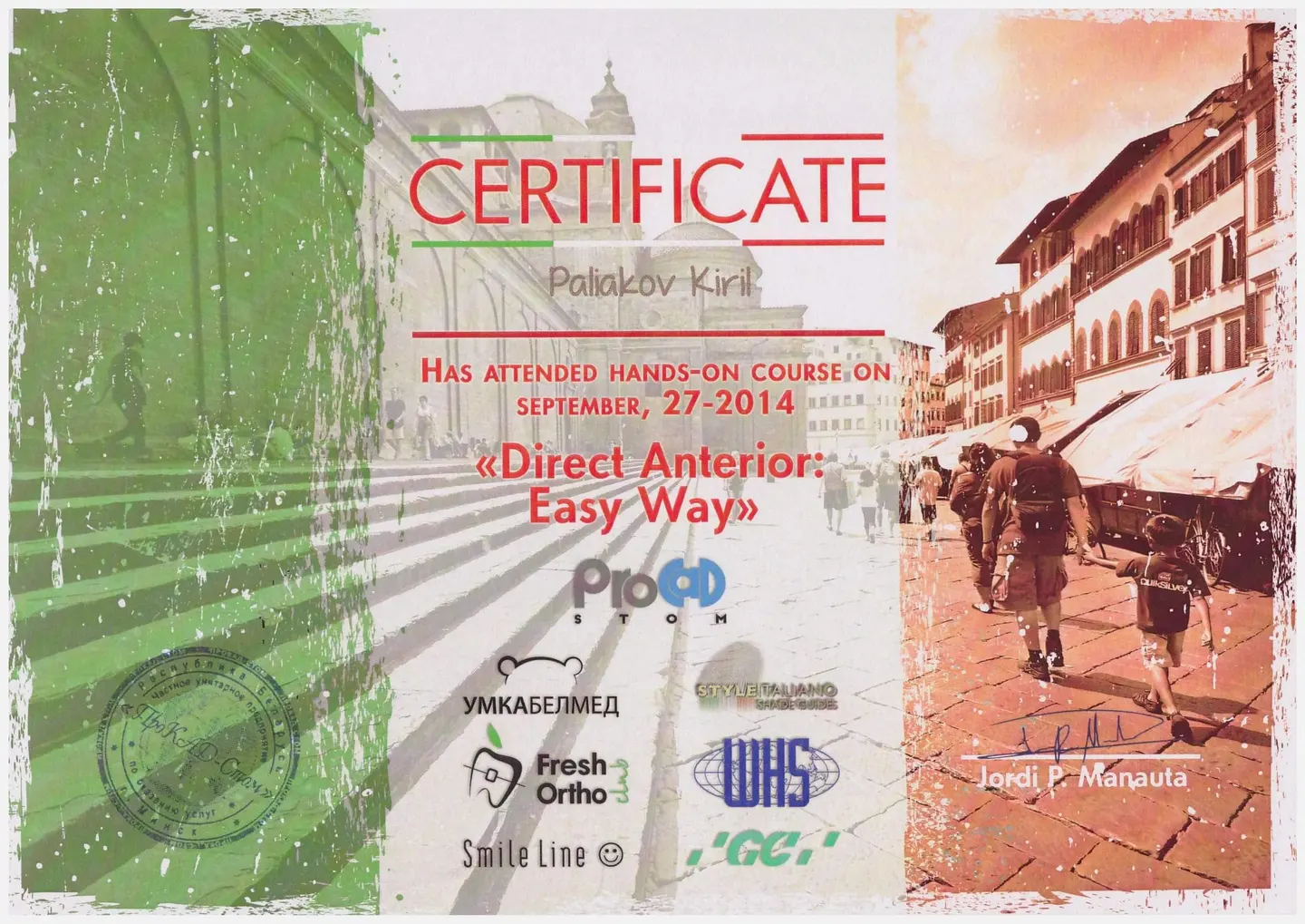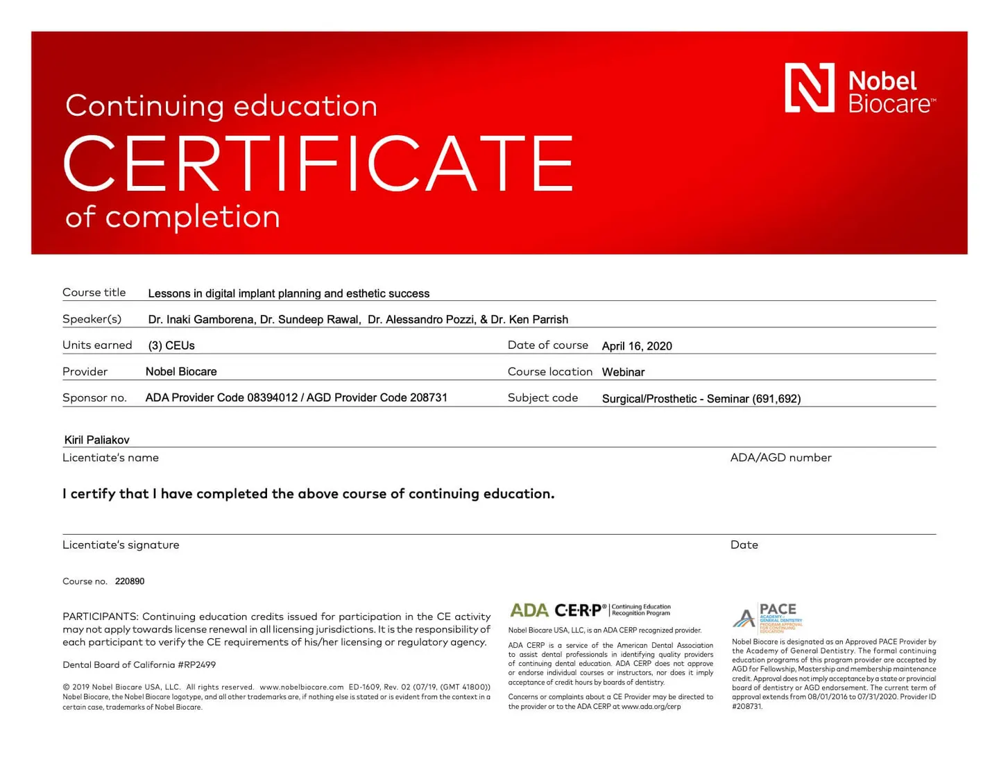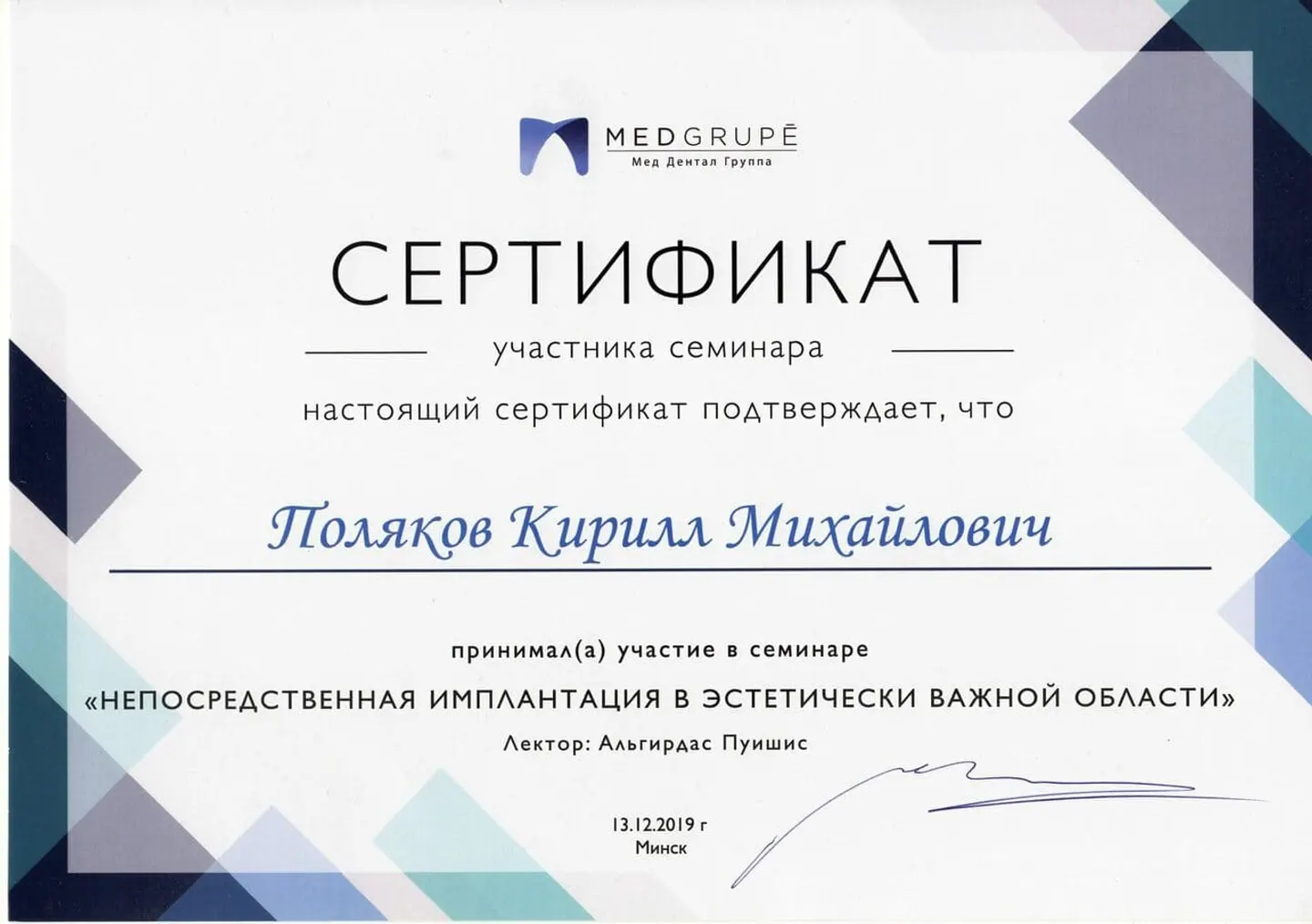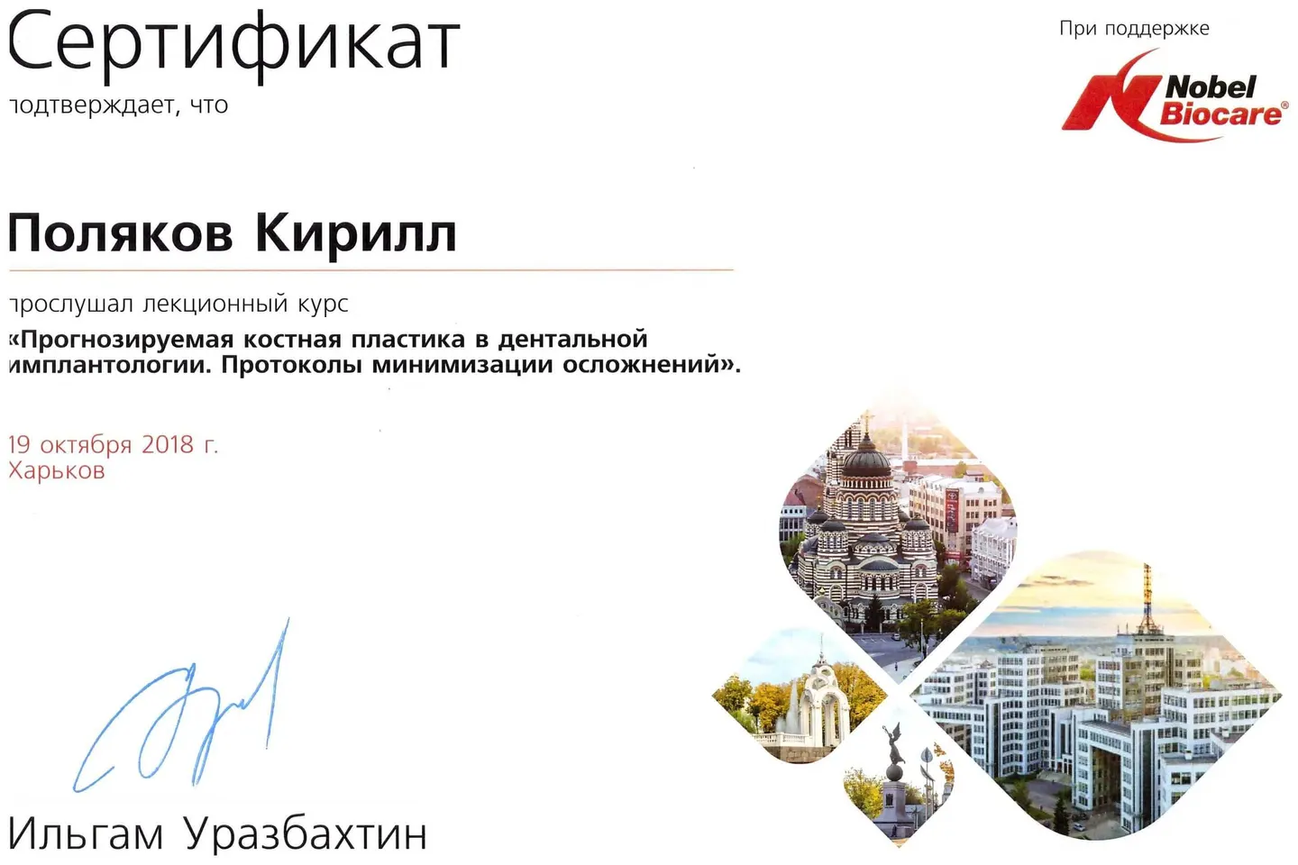 2019 - 2020 года - обучение в STEIGMANN INSTITUTE Heidelberg Германия) - имплантология, костная пластика и пластика мягких тканей.