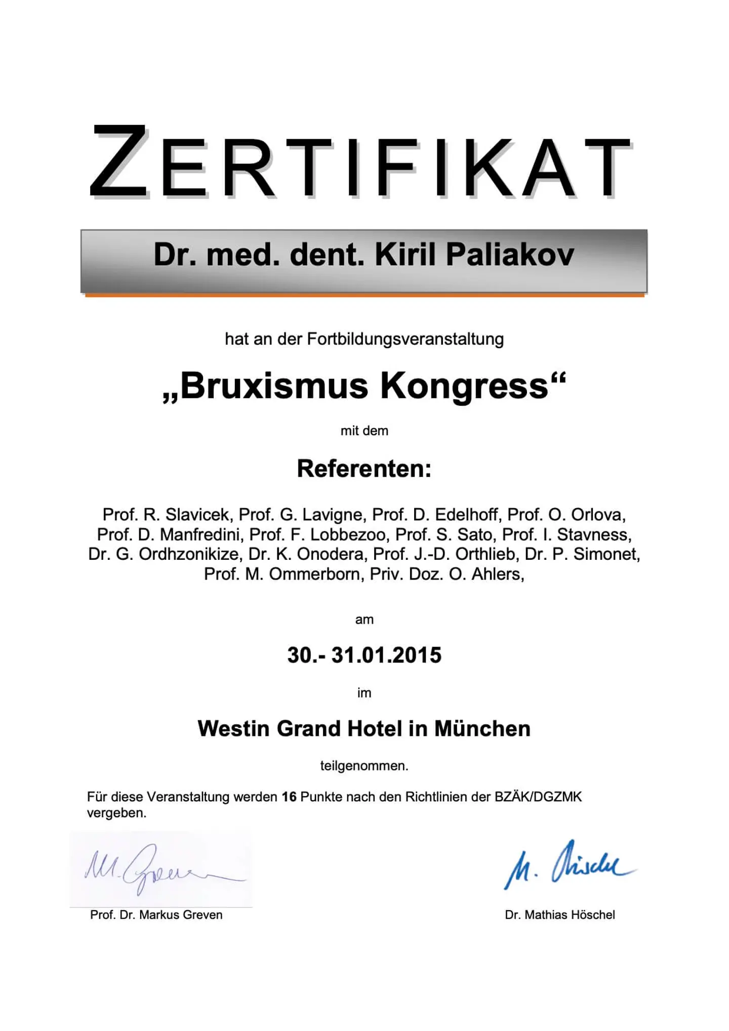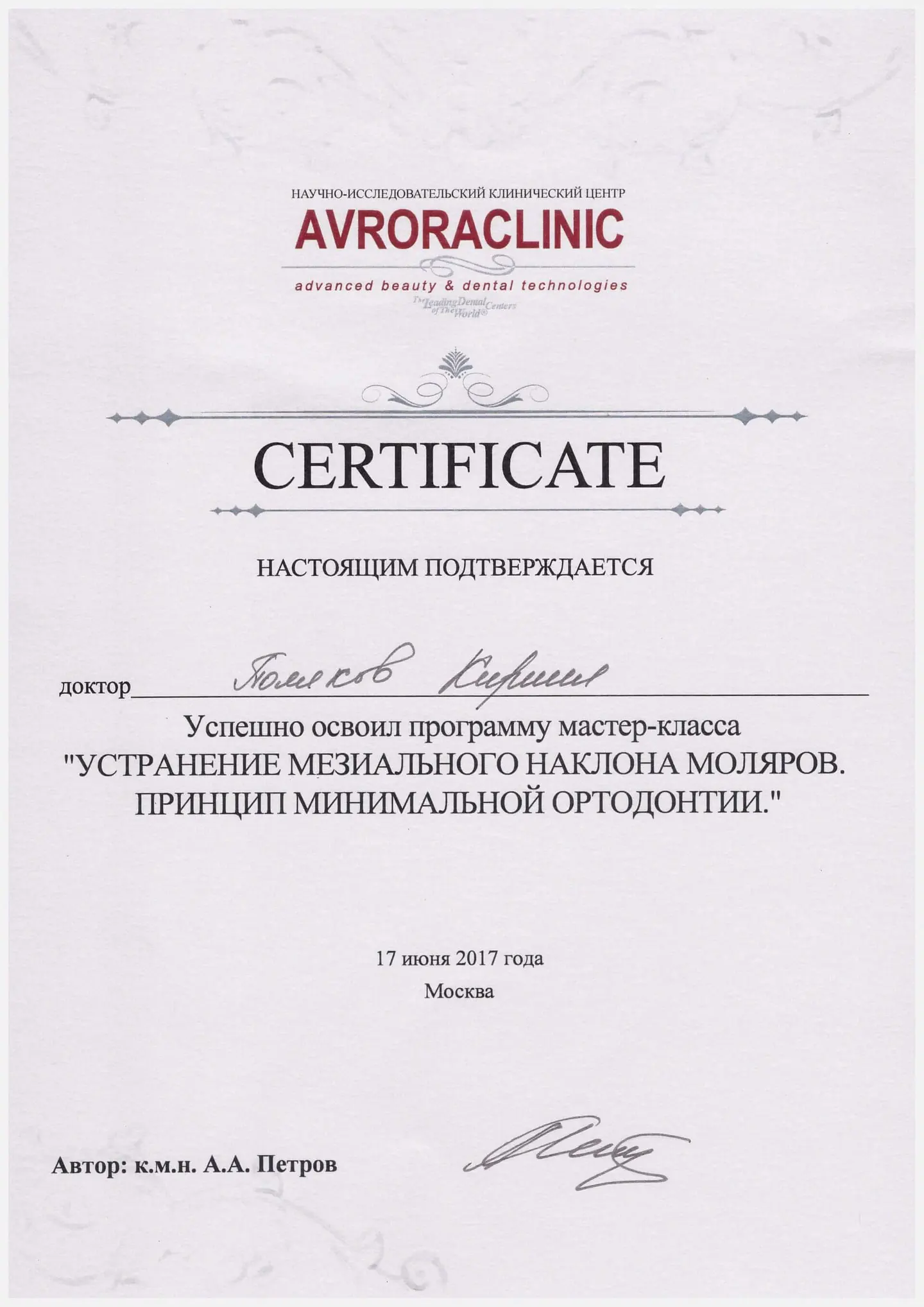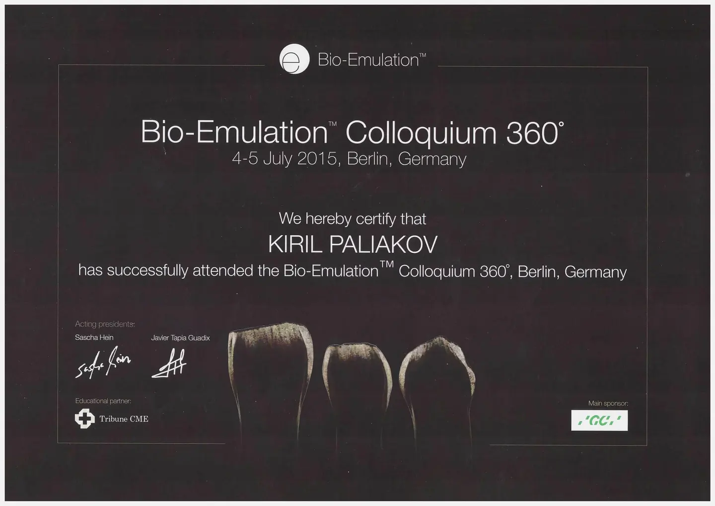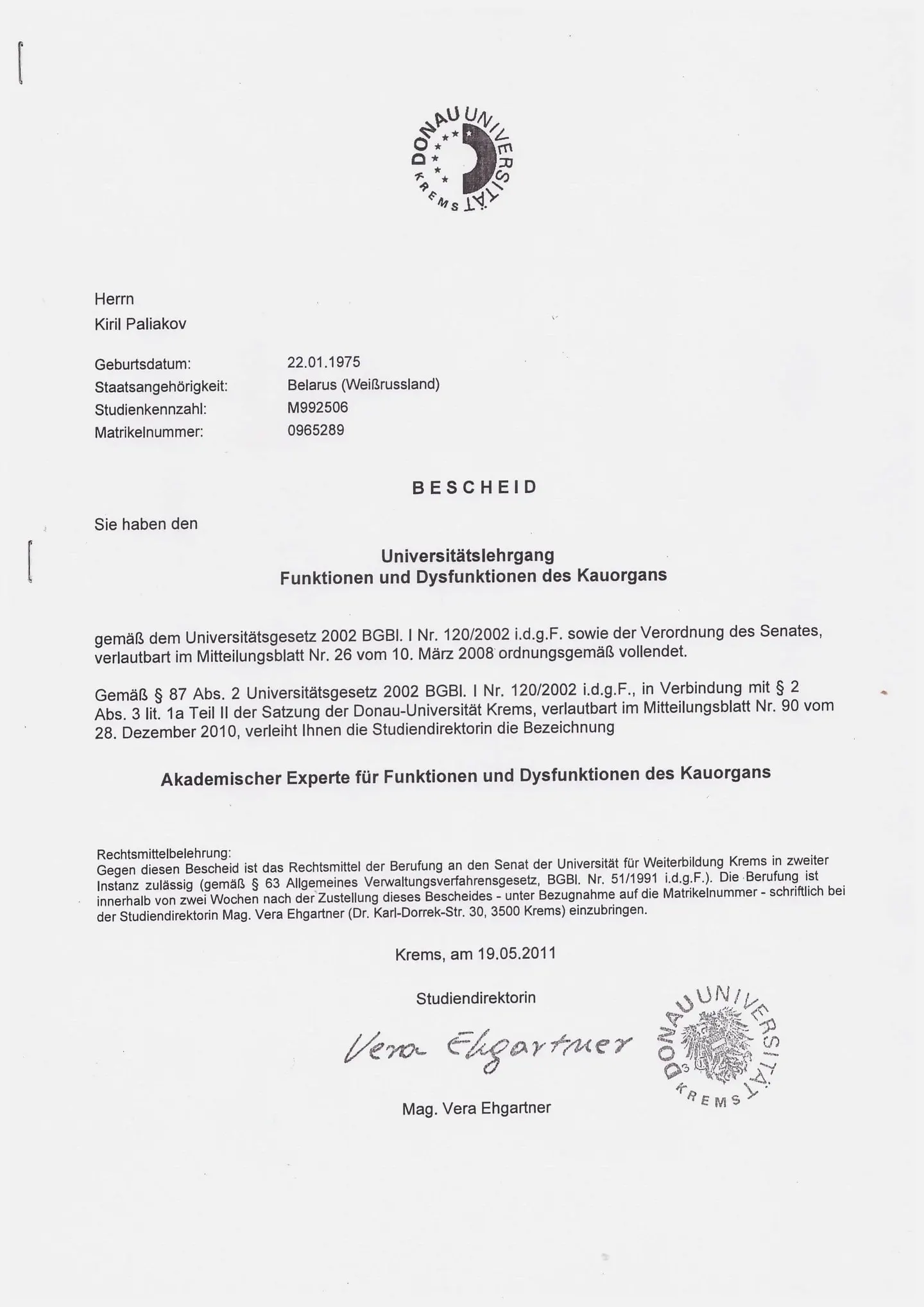 Обучение в Дунайском университете Кремса (Австрия), присвоено звание «Академический эксперт в области функции и дисфункции жевательного аппарата».