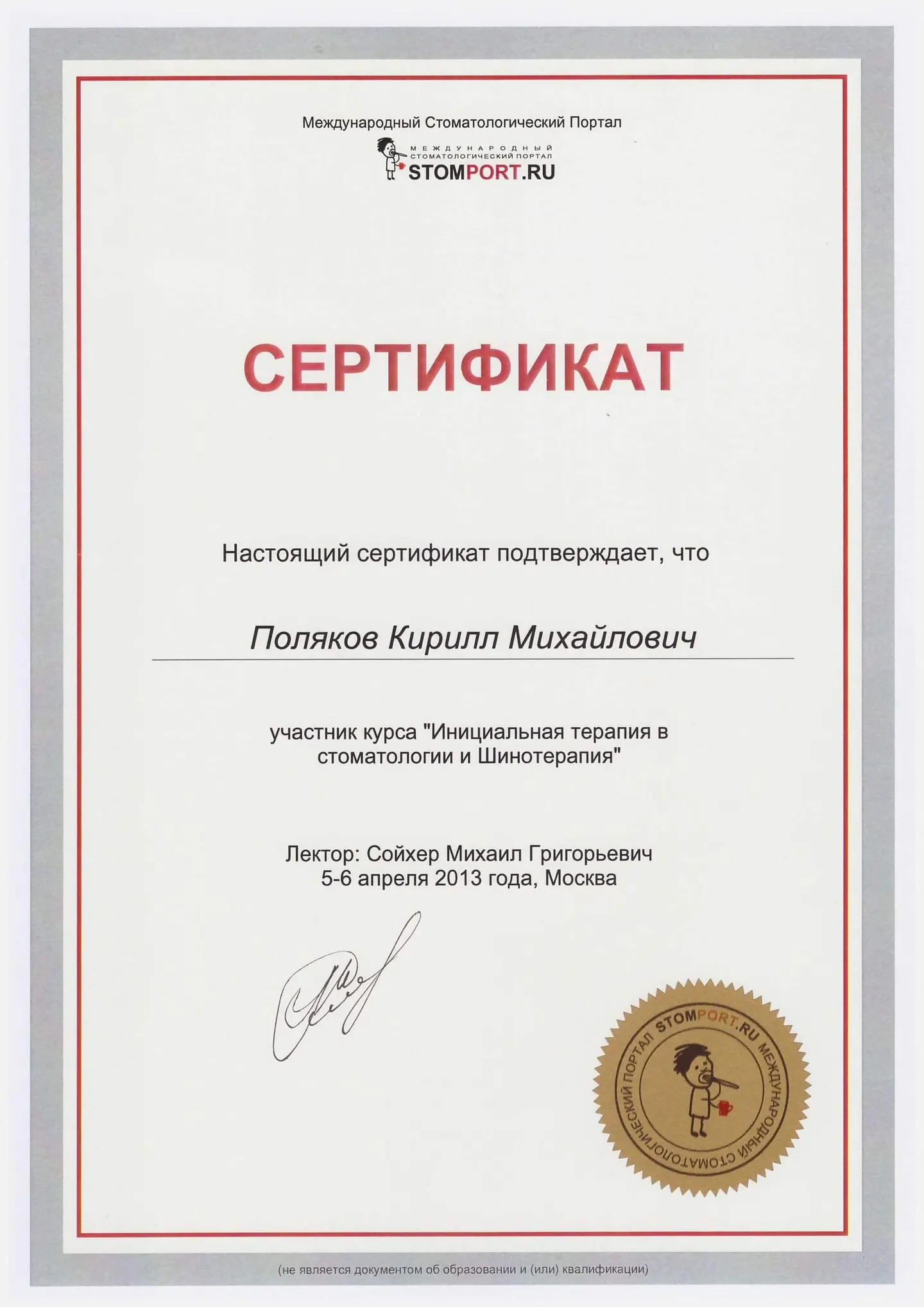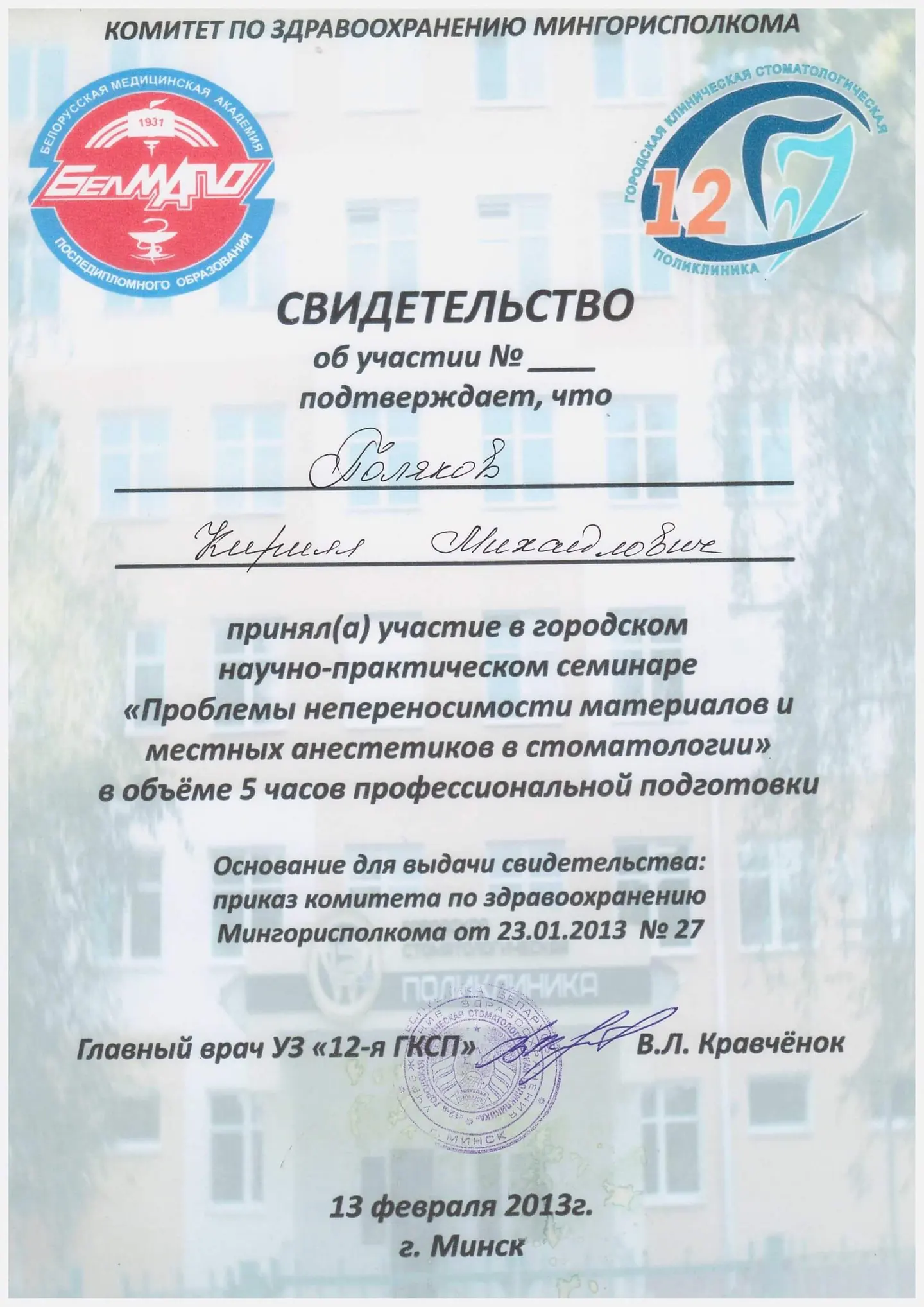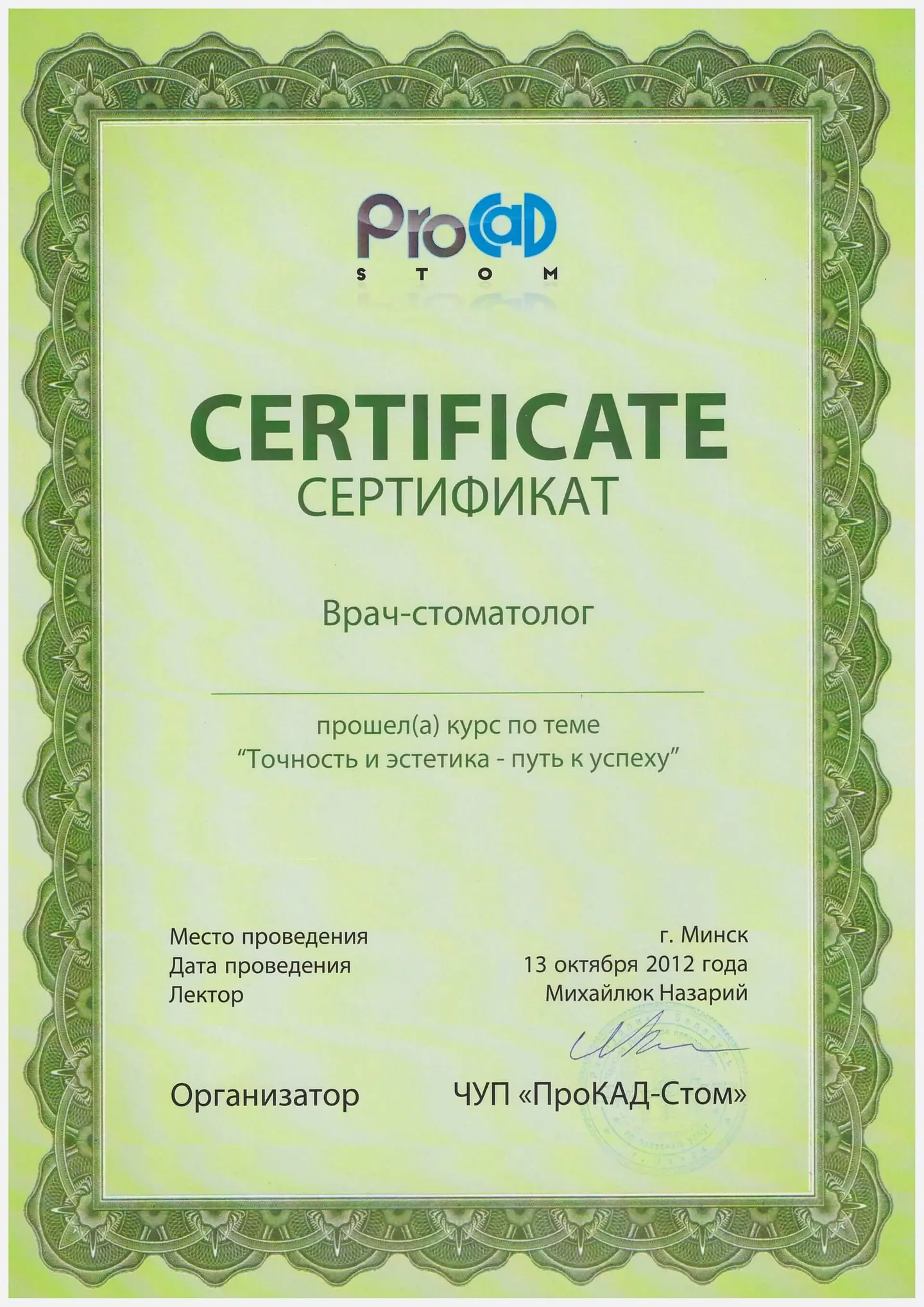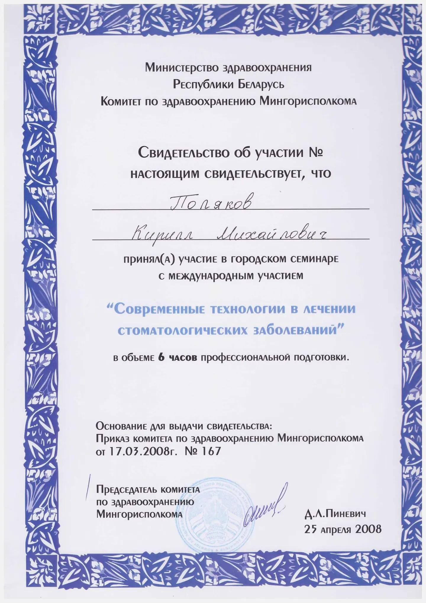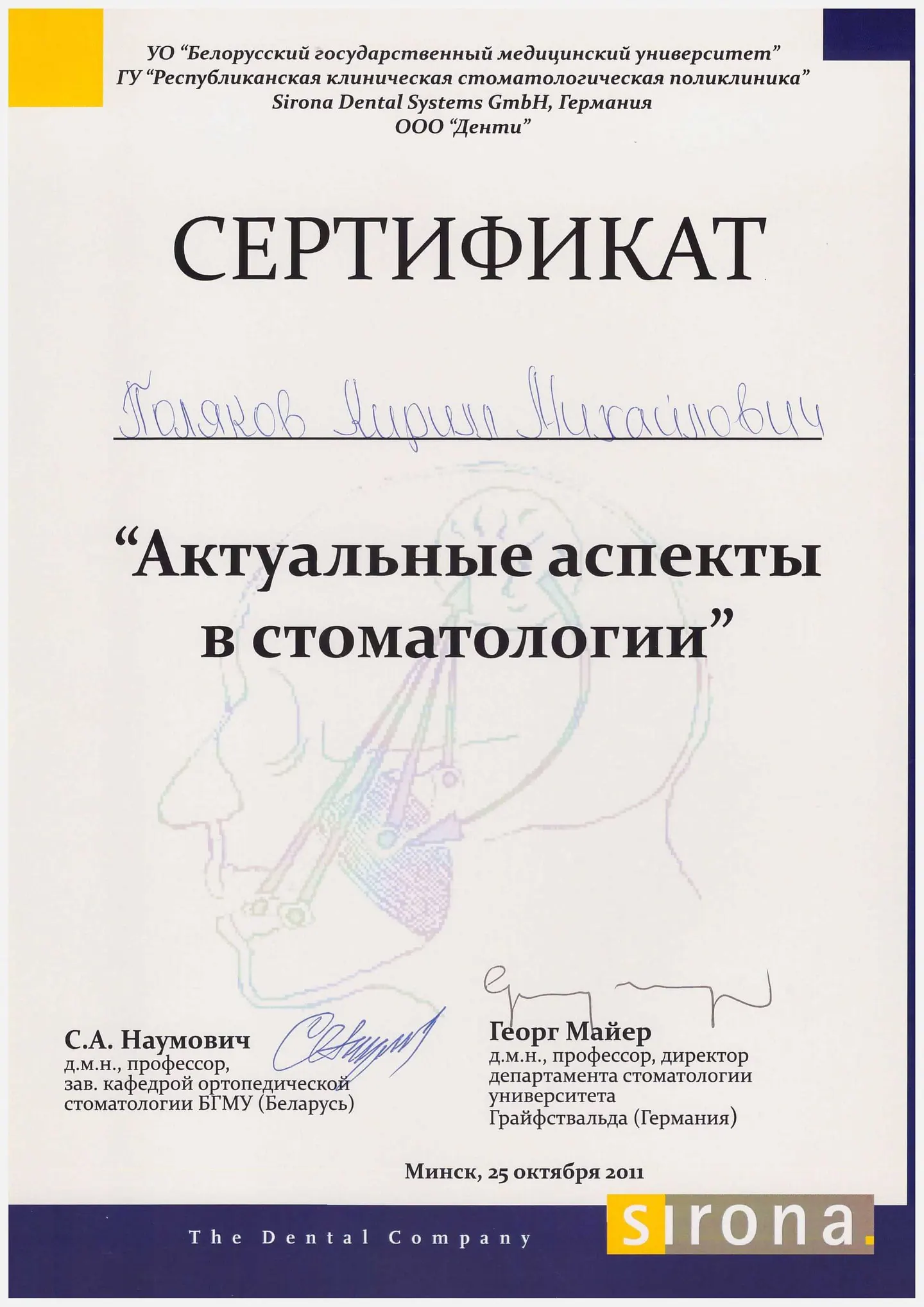 Выпускник Минского государственного Медицинского Института по специальности "стоматология", врач-стоматолог.