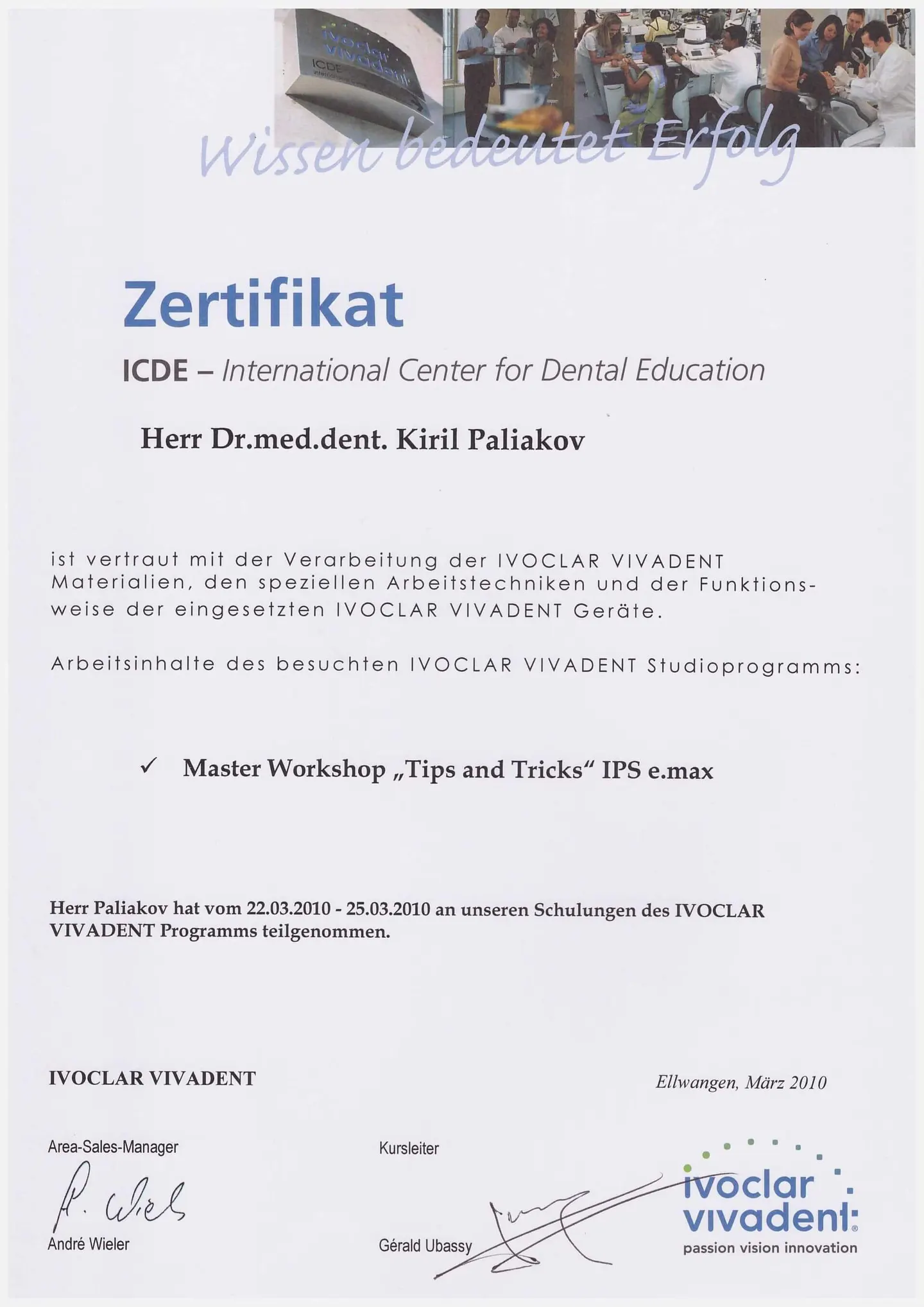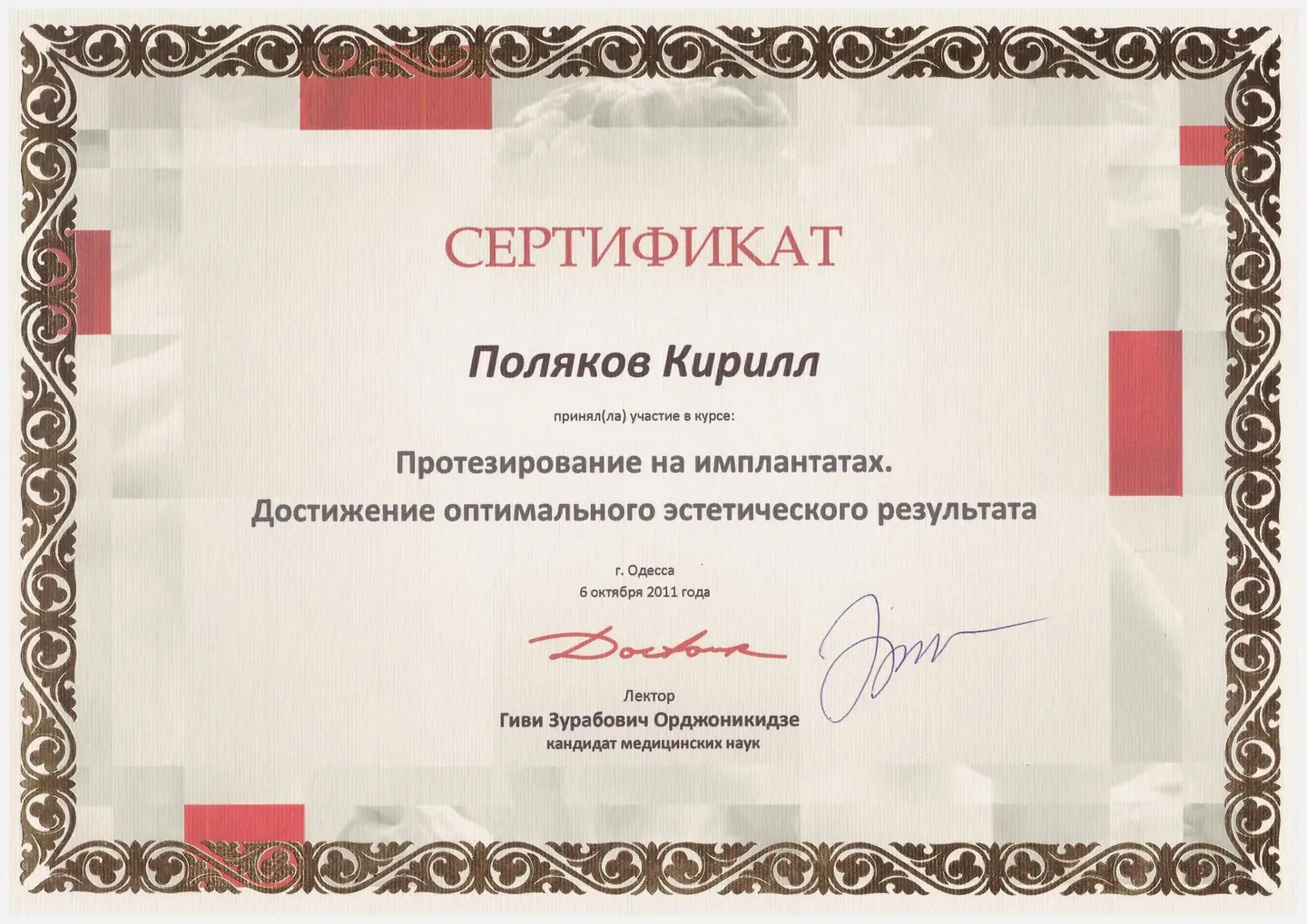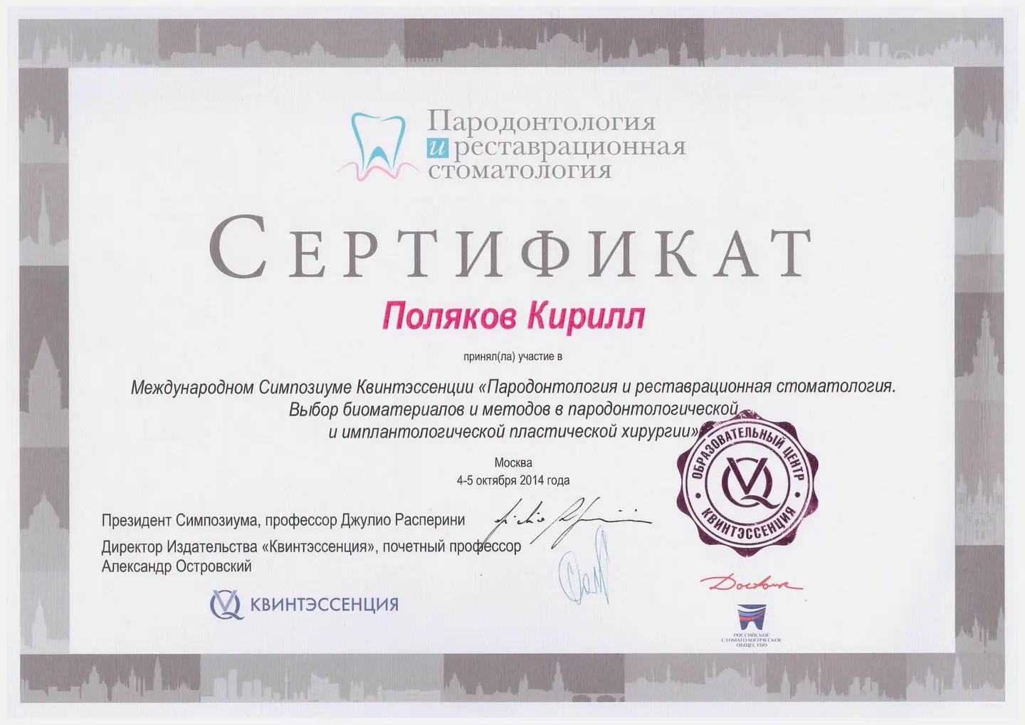 Обучение и работа в женевском университете (Швейцария) на кафедре ортопедической стоматологии, специализация – несъёмное протезирование.
